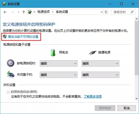 6、找到关机设置栏目,把第一个“启用快速启动(推荐)”前面的勾划上,点击保存修改按钮即可一键提升电脑开机速度。如图所示: