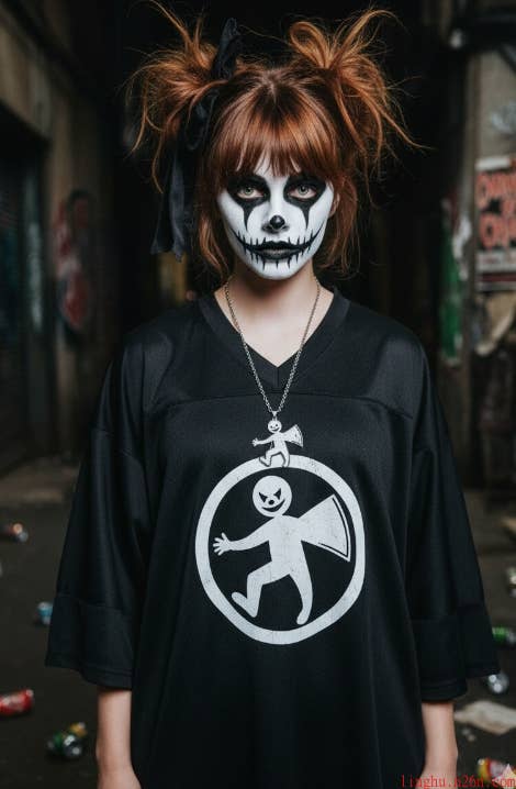 将此图中的女子修改为Juggalo(疯克小丑说唱)风格(小丑说唱 + 狂欢混乱):