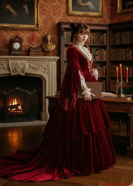 将此图中的女子修改为Red Academia(红色学术风)风格(学术风格与深红天鹅绒、格兰芬多气质相融合):