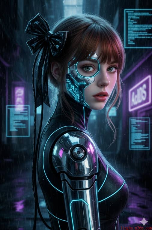 将此图中的女子修改为Robotcore(机械未来主义忧郁风)风格: