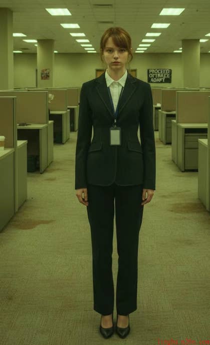 将此图中的女子修改为Liminal Office(边缘办公室/诡异官僚风)风格: