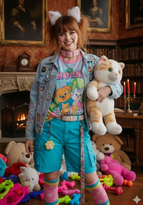 影响元素:Kidcore、兽人文化延伸、BDSM 宠物扮演俗艳风、怀旧 Neopets 与 Littlest Pet Shop。