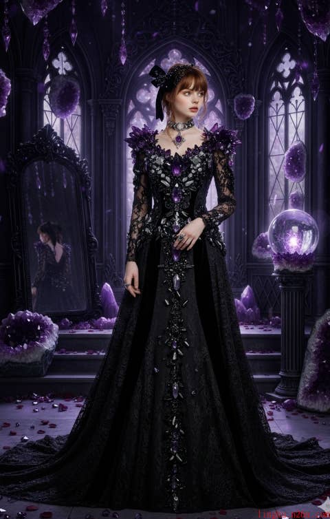 将此图中的女子修改为Crystalline Goth(水晶哥特)风格(矿物神秘主义 × 黑暗浪漫主义):