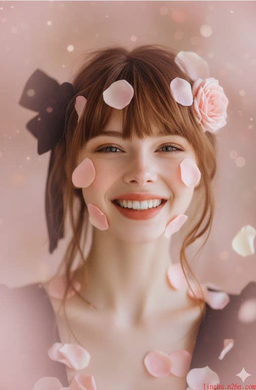 一张极致特写的写实风格人像:一位美丽的年轻女子盛装出席,脸上洋溢着喜悦。柔软精致的玫瑰花瓣轻轻飘落在她周围,有些停留在她的头发与皮肤上。光线柔和、漫射,营造出梦幻般的氛围。