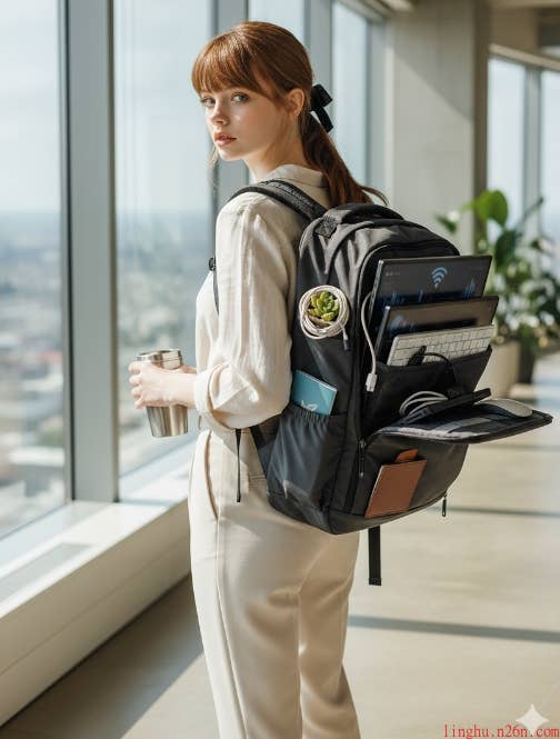 signature element: a perfectly organized backpack that transforms into a complete mobile office.