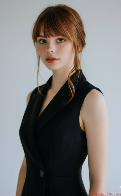 编辑此图中的女子:将她的服装改为合身的无袖黑色职业西装连衣裙。保留原有的面部细节和发丝,以保持真实感并避免 AI 生硬痕迹。调整她的面部朝向正前方,身体稍微挺直。裁剪为半身人像。背景为中性,搭配柔和的自然光。整体效果呈现写实风格的 LinkedIn 头像。